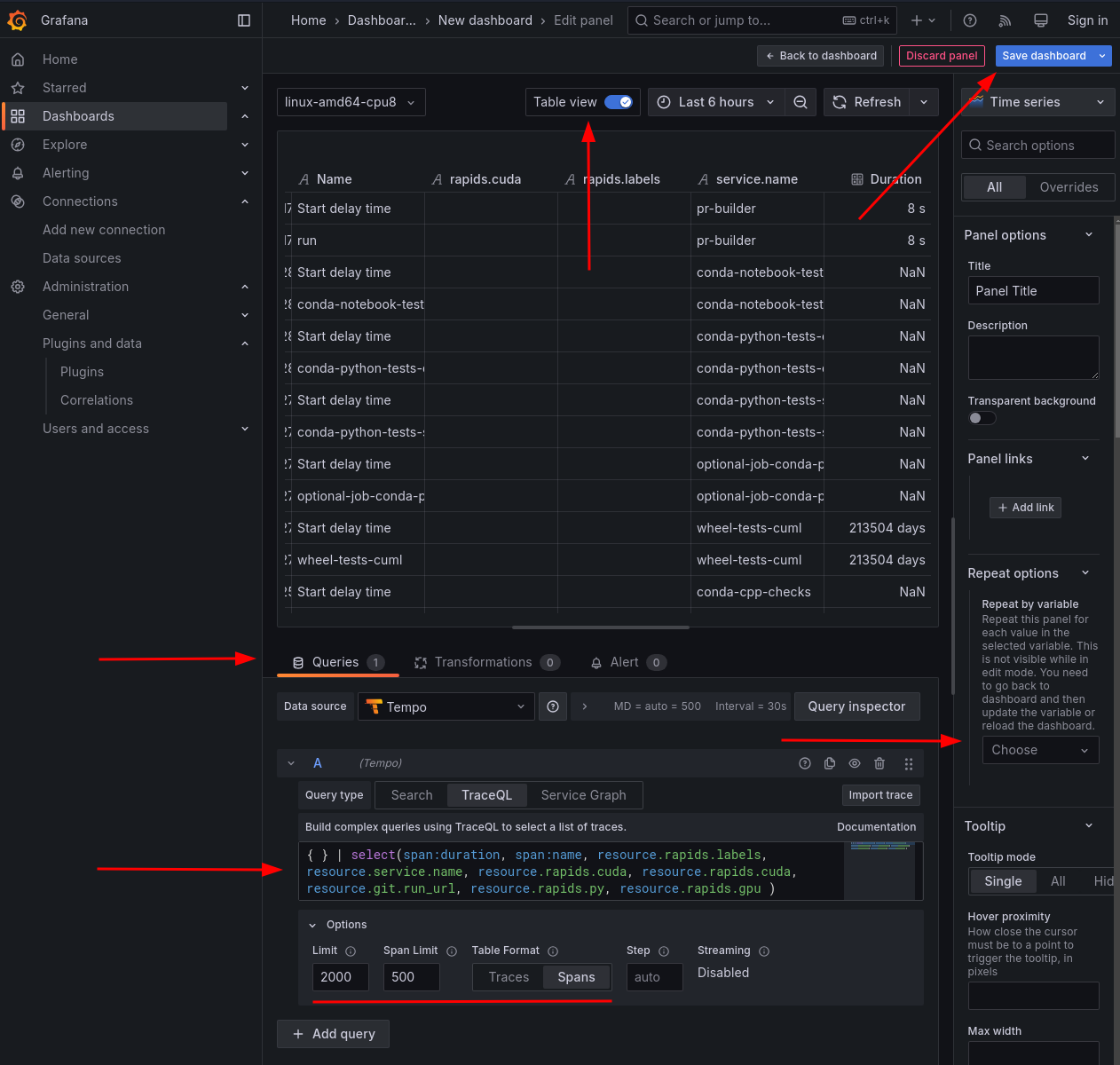 There is a gotcha with variables. Grafana has a way of automatically detecting values for variables - the “Query” variable type. This is the same as Tempo’s search tag values API. When it works, it is very convenient. However, it only works on recent data. If your data was collected some time ago, Grafana may fail to populate these fields. Because of this, it is generally worthwhile to use the “Custom” variable type and manually input variable values, instead of relying on Grafana/Tempo detecting them.